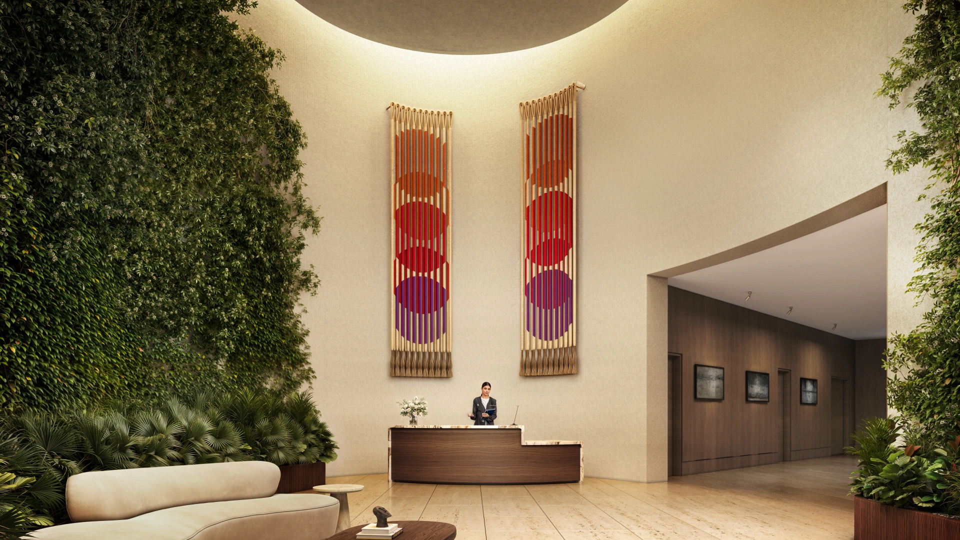 Soaring ceilings, sculpted lighting, and lush green walls. Rich tactile finishes in the lobby blend grandeur and intimacy, with a 24hr concierge and the services of a private members club.